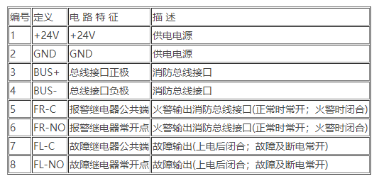 所有信號線和電源線宜采用截面積大于1.0mm的導線,并嚴格按規范要求進行布線,其中探測器外殼應良好接地。探測器接線定義見下表: