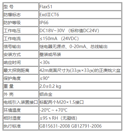 二.Flax51點型紫外火焰探測器技術參數