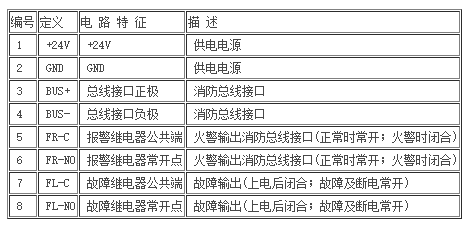 所有信號線和電源線宜采用截面積大于1.0mm的導線,并嚴格按規范要求進行布線,其中探測器外殼應良好接地。探測器接線定義見下表: