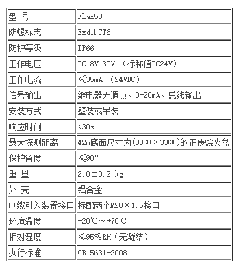 點型紅外火焰探測器(以下簡稱探測器)屬于防爆智能型火災探測設備,它運用了先進的多紅外傳感技(MIR),使用具有窄帶濾波的不同波長的紅外傳感器,其中一只傳感器工作在反映火焰信息的中心波長,另外兩只傳感器監視環境中的其他紅外輻射,結合火焰的閃爍特征,通過高性能的微處理器和先進的數學算法模型進行運算分析,使得只有符合火焰特征的輻射頻譜才會被確認為火警,而其他的干擾因素形成的假火警信號則會被排除。本探測器能夠對日光、閃電、電焊、人工光源、環境(人等)、熱輻射、電磁干擾、機械振動等干擾有很好的抑制,從而實現了對火焰信號的快速響應和準確識別。本探測器采用非接觸式探測,靈敏度現場可調,提供無源接點、標準電流輸出和總線接口與火災報警系統相連接。本探測器適用于無煙液體和氣體火災、產生煙的明火以及產生爆燃的場所。例如:航天工業、飛機庫、飛機修理場、化學工業、公路隧道、彈藥和爆炸品倉庫、油漆工廠、石油化工企業、制藥企業、發電站、印刷企業、易燃材料倉庫等可燃物含碳物質的其他場合。本探測器根據GB3836.1-2010《爆炸性氣體環境用電氣設備第1部分:通用要求》、GB3836.2-2010《爆炸性氣體環境用電氣設備第2部分:隔爆型“d”》的規定,制成隔爆型結構,其防爆標志:ExdⅡCT6。適用于工廠具有ⅡA、ⅡB、ⅡC級,引燃溫度組別為T1~T6組的1區、2區可燃性氣體或蒸氣與空氣形成的爆炸性混合物的場所。